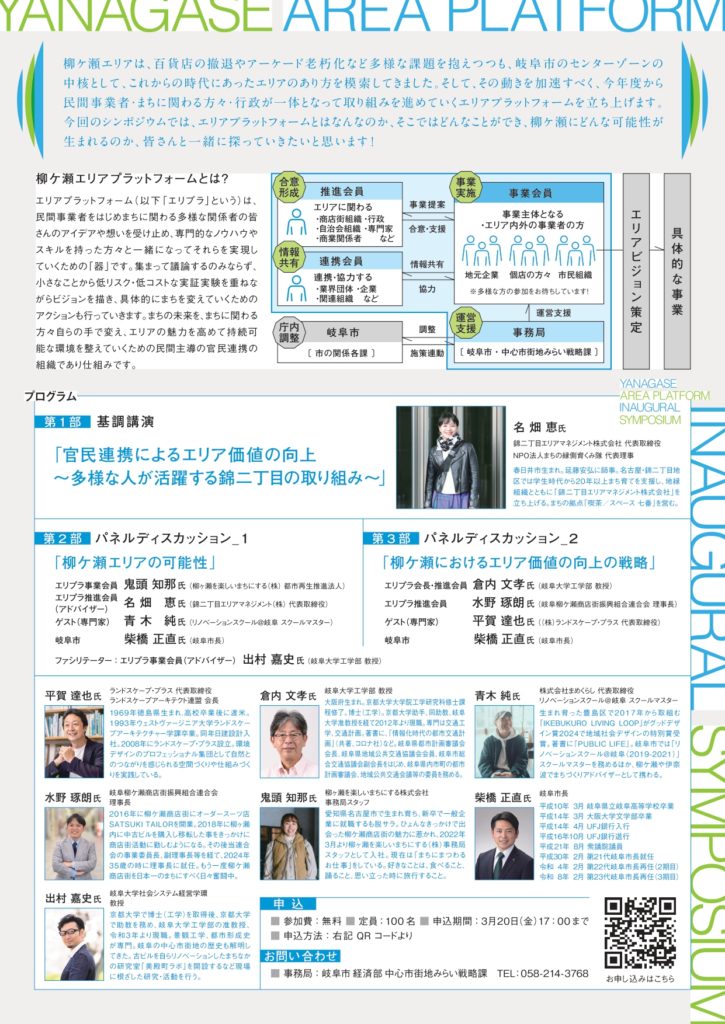 今回のシンポジウムでは、エリプラとはなんなのか、そこではどんなことができ、柳ケ瀬にどんな可能性が生まれるのか、皆さんと一緒に探っていきます!
