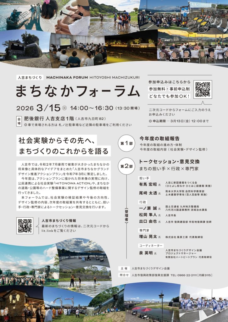 そこで、今年度のまちづくりに関する取組について報告・議論する人吉まちづくり「まちなかフォーラム」を開催します。社会実験やデザイン監修等の取組内容、次年度の取組案を共有し、担い手を交えたトークセッションを行います。