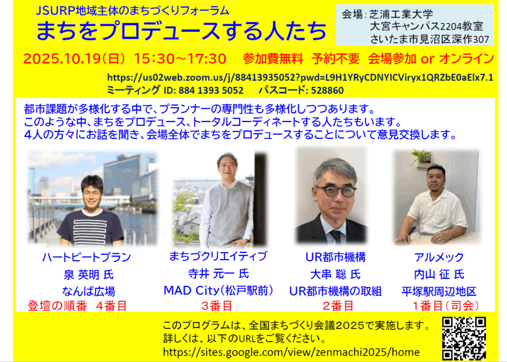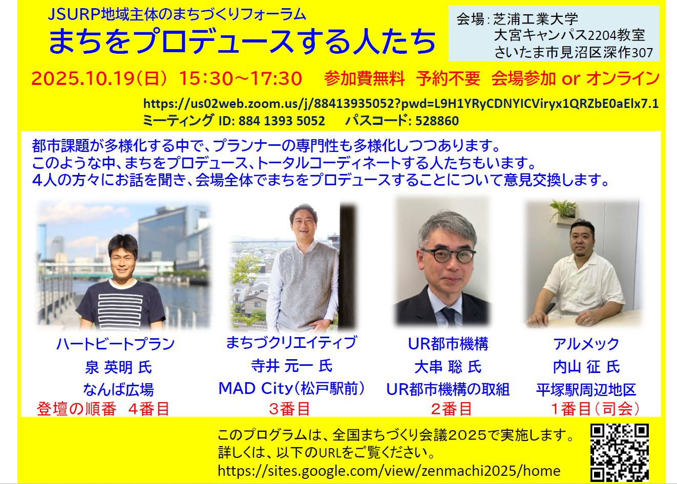 10月19日(日)に開催される、JSURP地域主体のまちづくりフォーラム「まちをプロデュースする人たち」に、泉がスピーカーとして登壇します。