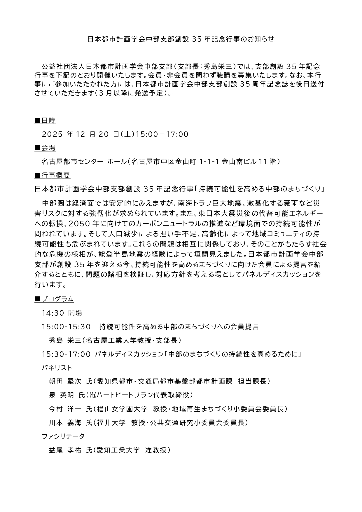 2025年12月20日に開催される、日本都市計画学会中部支部創設35年記念行事「持続可能性を高める中部のまちづくり」に、泉登壇します。