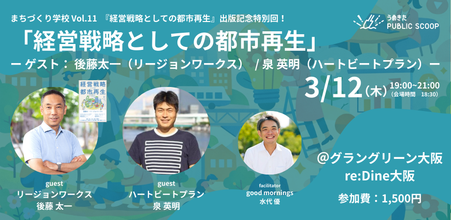 グラングリーン大阪にて、シリーズで展開している「まちづくり学校」の第11回に泉が登壇します。リージョンワークス代表・後藤太一さんが出版された「経営戦略としての都市再生」をテーマに、トークセッションを開催します。