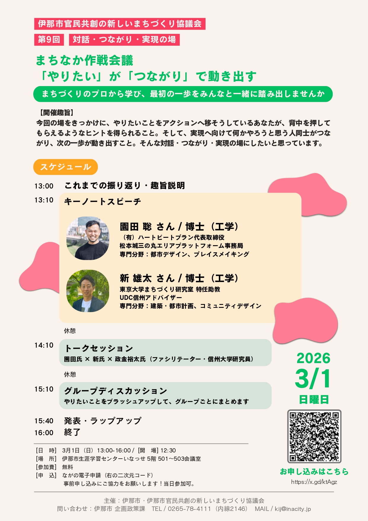 令和6年9月に立ち上げられた「伊那市官民共創の新しいまちづくり協議会」が主催する、参加する市民がまちづくりの主役となる場「対話・つながり・実現の場」に園田が登壇します。